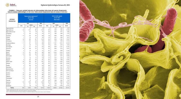 De acuerdo con el Boletín Epidemiológico número 40, volumen 42, correspondiente a la semana del 28 de septiembre al 4 de octubre de 2025, emitido por la Secretaría de Salud a través del Sistema Nacional de Vigilancia Epidemiológica (SINAVE), el estado de Tlaxcala registró 24 casos acumulados de tuberculosis respiratoria y 4 mil 883 casos de otitis media aguda.