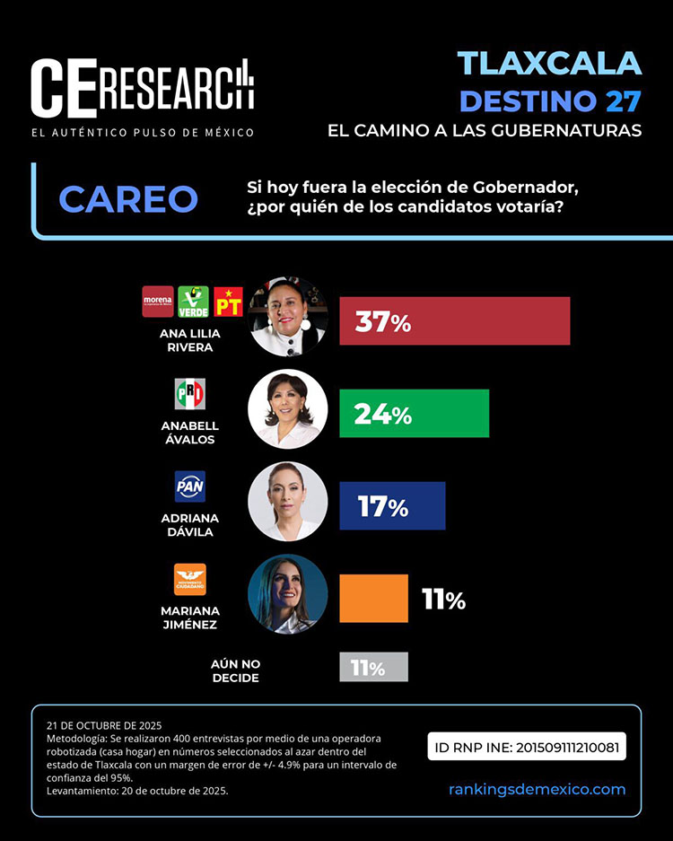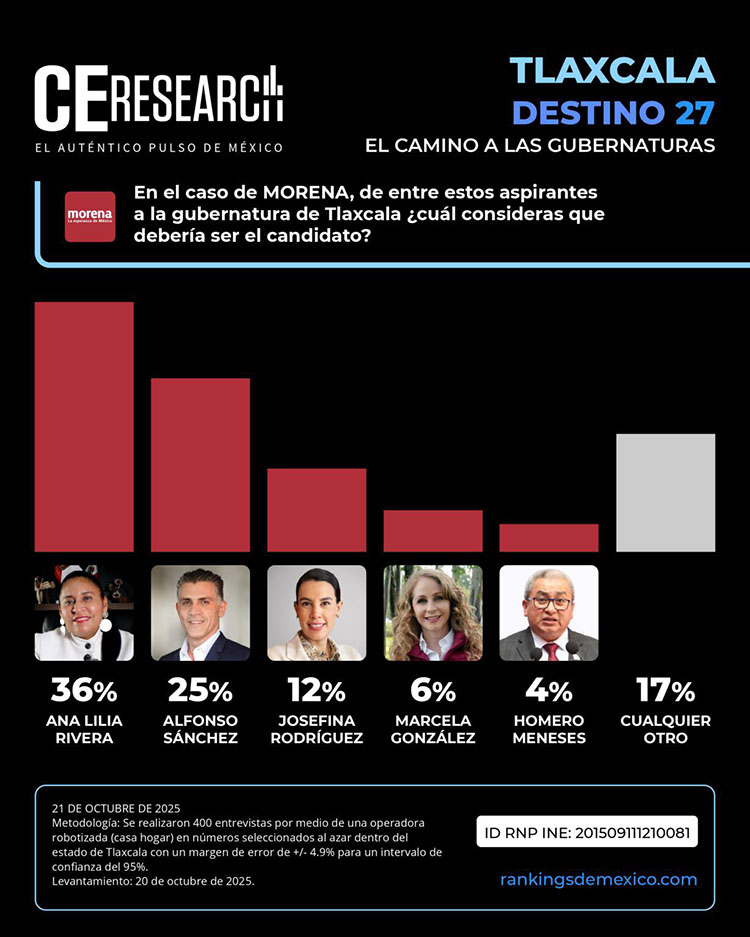 En la más reciente encuesta de C&E Reseach se ratifica a la Senadora Ana Lilia Rivera Rivera como la de las preferencias en Tlaxcala para la renovación de la gubernatura con el 36 por ciento de la simpatía, cifra que supera en gran medida a cualquiera que tenga intenciones de competir.