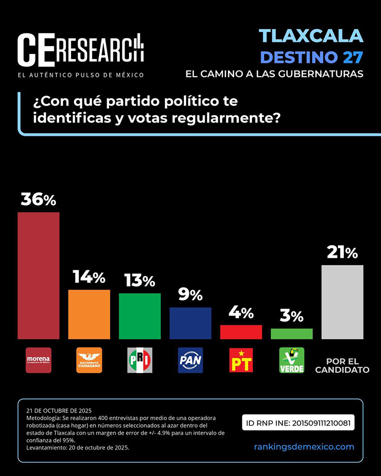 Incluso, la Senadora de MORENA duplica el porcentaje de electores que eligieron la opción “Cualquier otro candidato” que tiene un 17 por ciento, por lo que, de querer ganar, el partido guinda tendría que abanderarla para suceder en el cargo a Lorena Cuéllar Cisneros, quien tiene una aprobación de apenas 3 de 10 tlaxcaltecas, luego de haber sido “la más votada”.