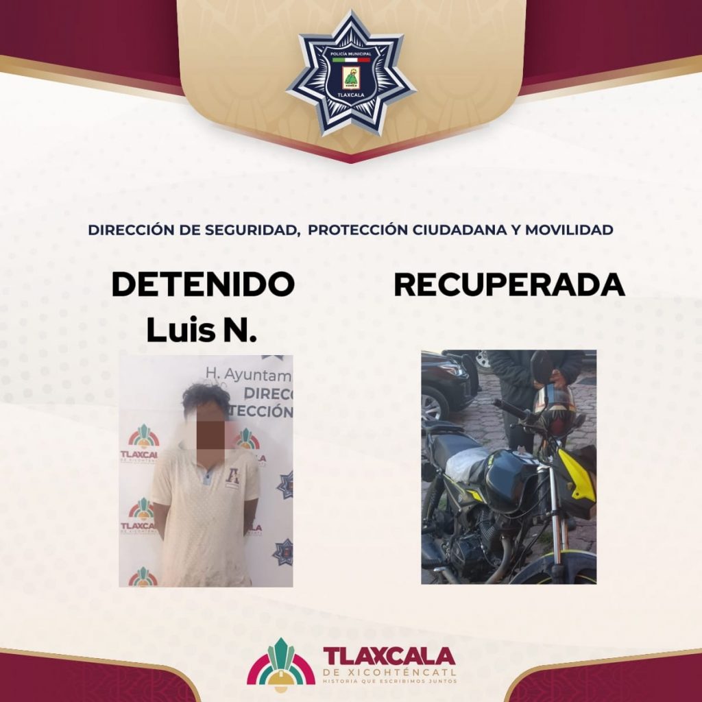 Elementos de la Dirección de Seguridad, Protección Ciudadana y Movilidad del municipio de Tlaxcala recuperaron una motocicleta y detuvieron a un presunto responsable del atraco, gracias a la coordinación oportuna entre el personal en campo y el monitoreo del Centro de Control y Comando (C2) municipal.