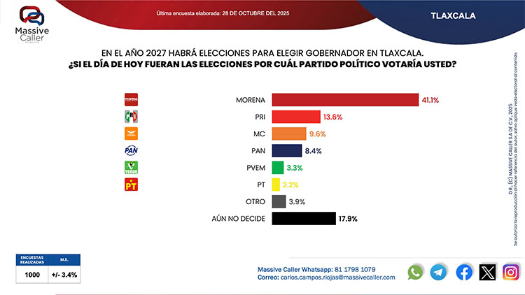 La preferencia que tiene MORENA para la renovación de la gubernatura en Tlaxcala es de 41.1 por ciento, puntuación que no alcanzan a igualar los partidos de oposición ya que el PRI tiene un 13.6 por ciento, MC un 9.6 y el PAN un 8.4, juntos a penas logran un 31.6 por ciento, de acuerdo con la encuesta de octubre de “Massive Caller”.