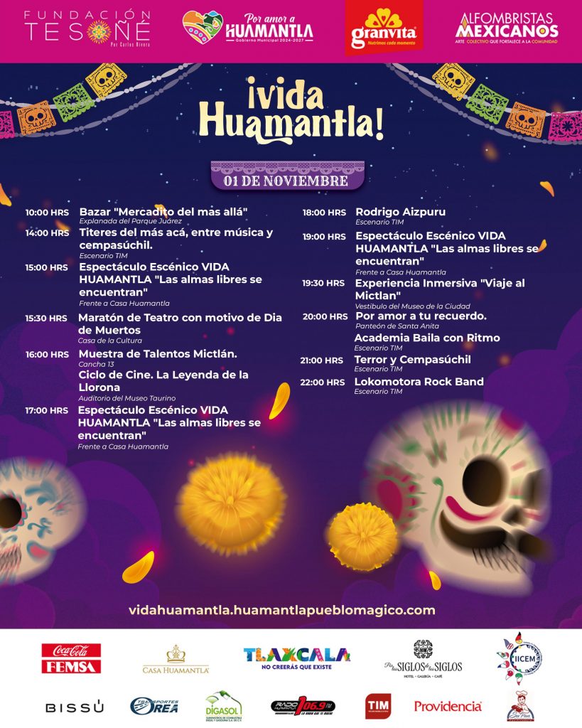 En el marco del Festival Vida Huamantla, el Gobierno Municipal 2024–2027 invita a la ciudadanía y a visitantes a disfrutar de las actividades artísticas y culturales programadas para este 1 de noviembre en diversos espacios del municipio, donde la tradición, el arte efímero y la convivencia familiar son el corazón de esta celebración.