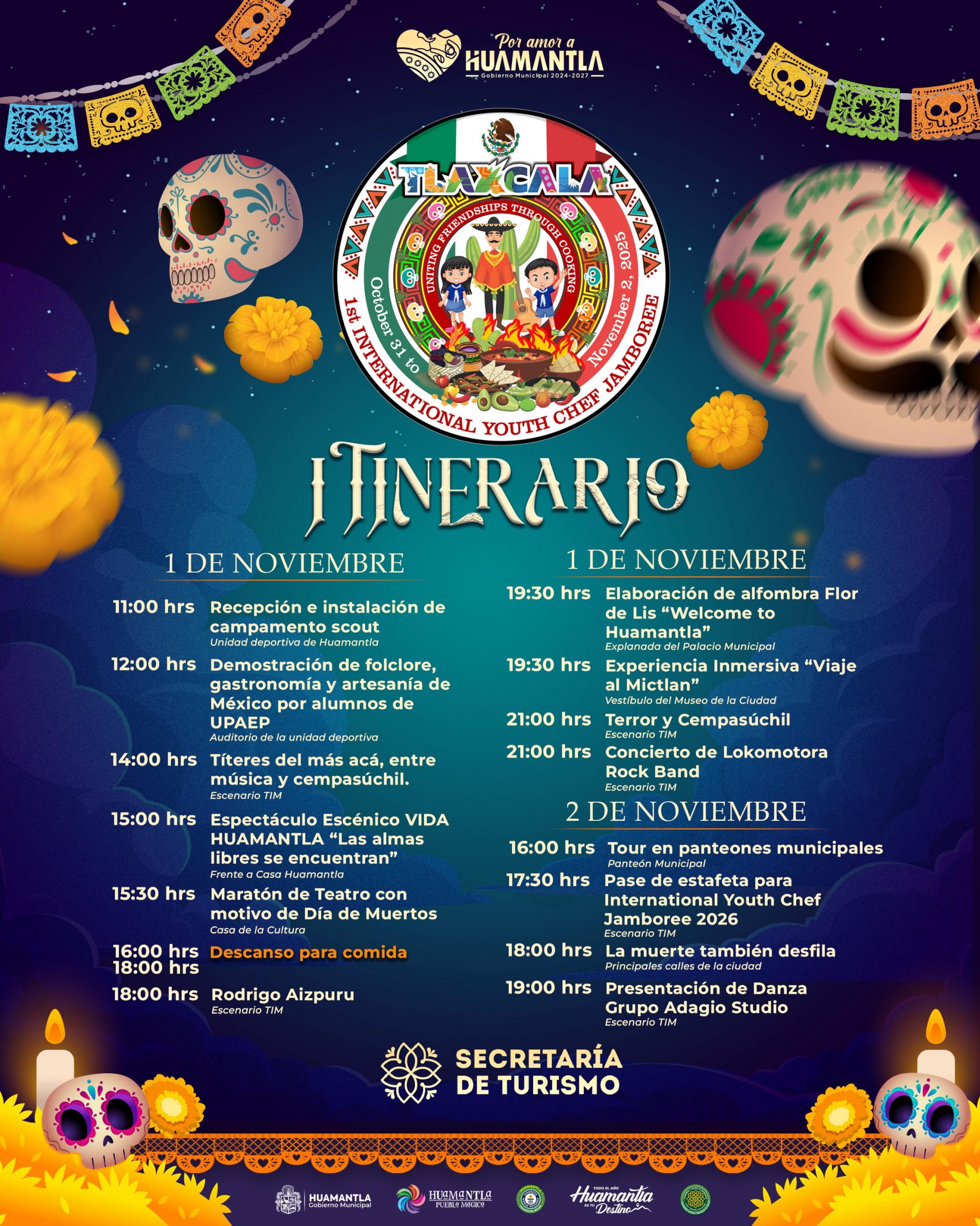 En el marco del Festival Vida Huamantla, el Gobierno Municipal 2024–2027 invita a la ciudadanía y a visitantes a disfrutar de las actividades artísticas y culturales programadas para este 1 de noviembre en diversos espacios del municipio, donde la tradición, el arte efímero y la convivencia familiar son el corazón de esta celebración.