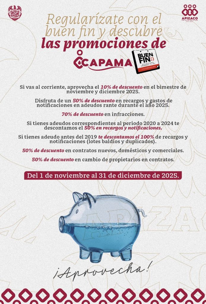 • El Ayuntamiento de Apizaco invita a la ciudadanía a aprovechar los beneficios del Buen Fin y las promociones por pago anual anticipado, disponibles del 1 de noviembre de 2025 al 28 de febrero de 2026.