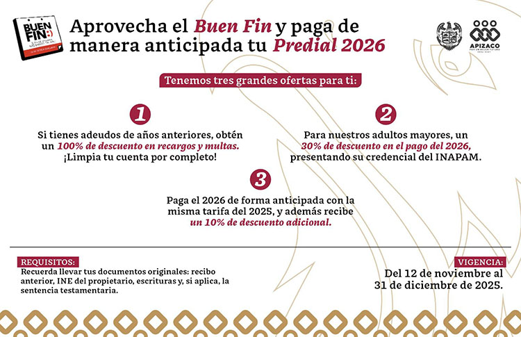 El Gobierno Municipal de Apizaco que preside Javier Rivera Bonilla, a través del Área de Predial, invita a la ciudadanía a aprovechar la Campaña de Pago Anticipado del Predial 2026, que se suma a las promociones de El Buen Fin, ofreciendo importantes descuentos y beneficios para las y los contribuyentes.