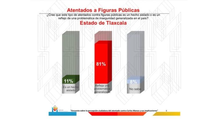La ciudadanía tlaxcalteca se muestra profundamente preocupada por el clima de violencia en el país y su impacto en la seguridad local. De acuerdo con la encuesta “Percepción Ciudadana del Atentado Contra Carlos Manzo y sus Implicaciones”, realizada por Impulso Mercadológico en noviembre de 2025, el 81% de los tlaxcaltecas considera que los ataques a figuras políticas son un reflejo de la inseguridad generalizada en México, más que hechos aislados.
