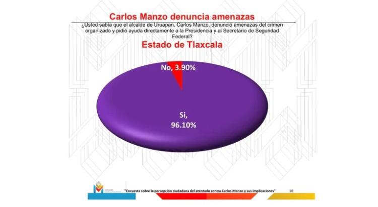 Respecto a la actuación del gobierno federal, el 81.58% de los tlaxcaltecas opinó que las autoridades debieron atender con mayor urgencia las denuncias de amenazas que Carlos Manzo presentó ante la Presidencia y la Secretaría de Seguridad. Además, el 48.53% considera responsables tanto a la presidenta Claudia Sheinbaum como al secretario de Seguridad, Omar García Harfuch, por la falta de protección al exalcalde.