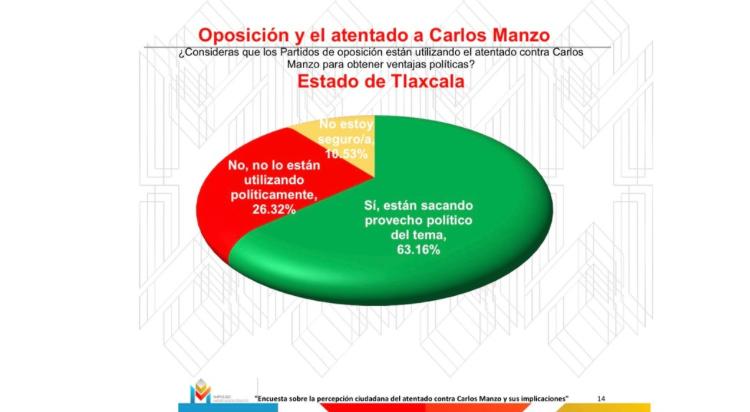 La encuesta también revela una notable desconfianza hacia la clase política, ya que el 63.16% de los participantes en Tlaxcala cree que los partidos de oposición están utilizando el atentado con fines políticos, mientras que solo un 26.32% lo descarta.