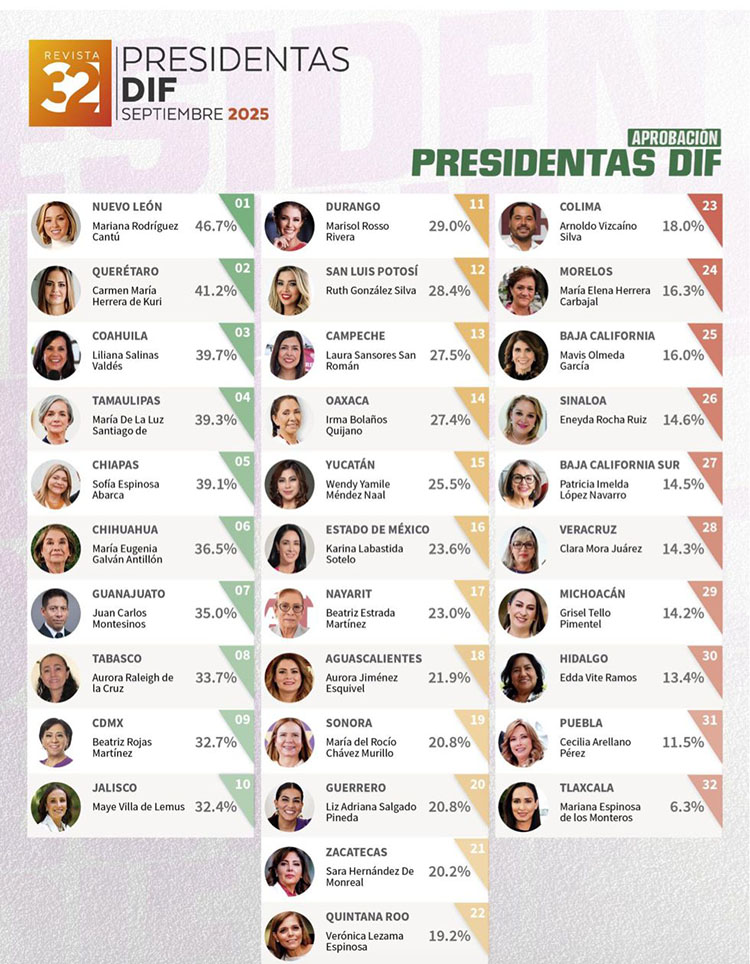 La Gobernadora de Tlaxcala, Lorena Cuéllar Cisneros y su hija la Presidenta Honorífica del SEDIF, Mariana Espinosa de los Monteros Cuéllar, son las peores evaluadas en sus cargos a nivel nacional ocupando el último lugar, de acuerdo con la empresa encuestadora Arias que difunde la «Revista 32».