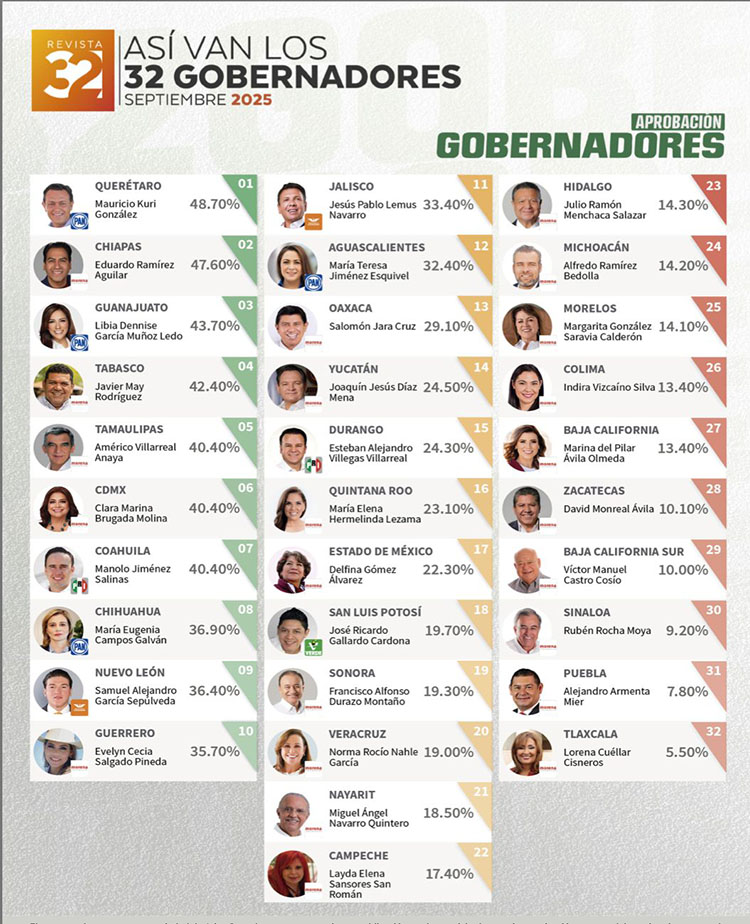 Ello le valió a Cuéllar Cisneros el lugar 32 a nivel nacional, colocándose como la gobernadora con la peor aprobación; detrás se ubicaron sus homólogos de Puebla, Alejandro Armenta y de Sinaloa, Rubén Rocha Moya.