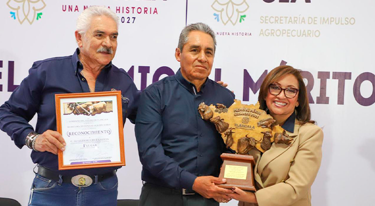 En la ceremonia, la gobernadora Lorena Cuéllar entregó el Premio al Mérito Ganadero 2025 a: Guillermo Cruz Galicia, de Granja Acuícola Las Ranas (Hueyotlipan), por su compromiso en producción acuícola; y reconoció el esfuerzo de Amado Carlos Guevara Solís, de Rancho de Ita, por su liderazgo en producción ovina, así como a Enrique Rodríguez Susano, de Granjas R, por su modelo de eficiencia en porcicultura.
