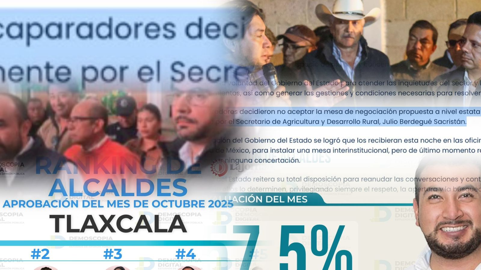 El reciente estudio de Demoscopia Digital movió el tablero en la aprobación de alcaldes. En octubre el mejor calificado fue el ecologista de Huamantla, Salvador Santos; le siguen el capitalino morenista Alfonso Sánchez; la de Chiautempan, Blanca Angulo; y el de Apizaco, Javier Rivera.