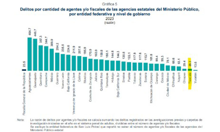 Tlaxcala es el segundo estado del país en donde cada agente del Ministerio Público investiga una menor cantidad de delitos en comparación con otras entidades, ya que en 2023 eran 28.3, mientras que en Aguascalientes eran 464.7, de acuerdo con las Estadísticas a propósito del Día Nacional del Ministerio Público.