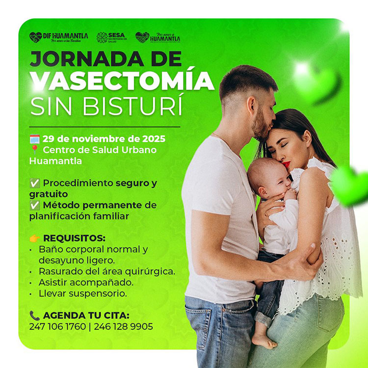 El Gobierno Municipal de Huamantla invita a todos los hombres interesados en participar en la jornada gratuita de vasectomías sin bisturí que organizará la Secretaría de Salud (SESA) el próximo 29 de noviembre en el Centro de Salud Urbano de Huamantla.