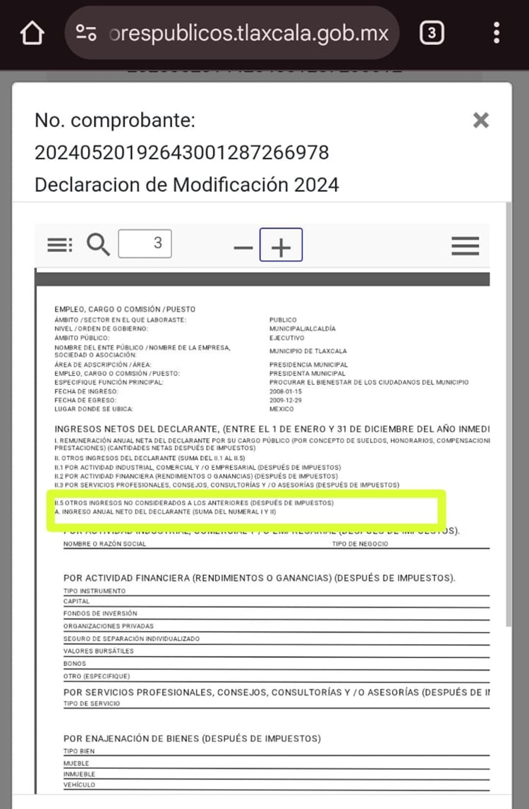 Al ingresar a la liga se encuentra el sitio para consultar la información referida, la cual arroja las declaraciones patrimoniales de la electa de Movimiento Regeneración Nacional (MORENA) en Tlaxcala, de 2021 con «modificaciones» en los años subsecuentes.