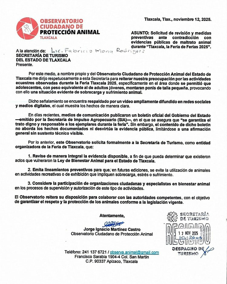 A partir de ello, el Observatorio Ciudadano de Protección Animal exhortó a la Secretaría de Turismo (SECTURE), a cargo de Fabricio Mena Rodríguez, como ente responsable de la organización de la Feria de Tlaxcala, que revise la evidencia difundida en redes sociales para determinar si existe una vulneración a la Ley de Bienestar Animal del estado.