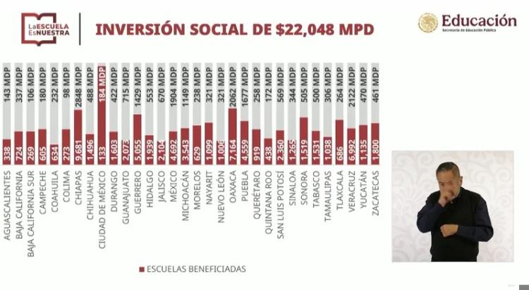 Durante la conferencia matutina, Pamela López Ruiz, directora general del programa La Escuela es Nuestra (PLEEN), presentó el reporte nacional de inversión social, que asciende a 22 mil 048 millones de pesos destinados a infraestructura y mantenimiento de planteles educativos.