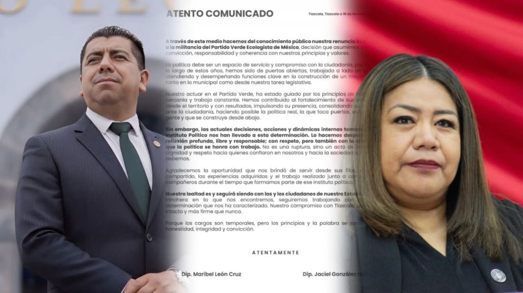 Este martes, la Diputada Presidenta de la Mesa Directiva del Congreso del Estado, Maribel León Cruz y el Diputado Presidente de la Comisión de Puntos Constitucionales Gobernación y Justicia y Asuntos Políticos, Jaciel González Herrera, anunciaron su renuncia al Partido Verde Ecologista de México (PVEM).