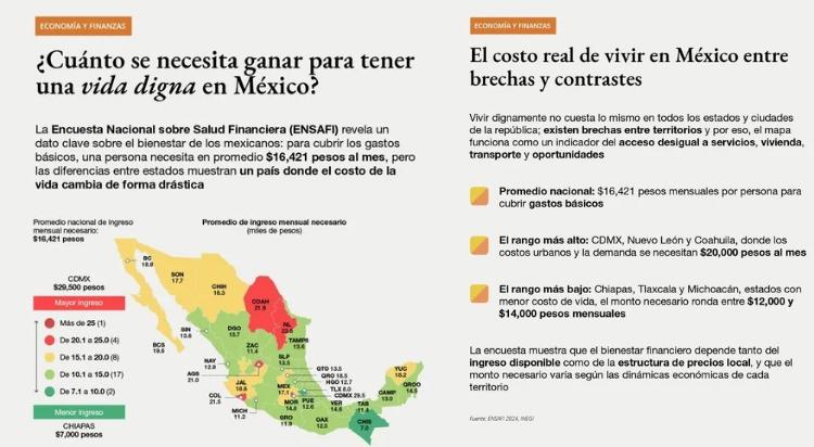 La Encuesta Nacional sobre Salud Financiera (ENSAFI) reveló el costo real de vivir en México, evidenciando profundas brechas y contrastes entre estados. De acuerdo con el estudio, una persona necesita en promedio $16,421 pesos mensuales para cubrir los gastos esenciales; sin embargo, esta cifra cambia de forma significativa dependiendo del territorio.