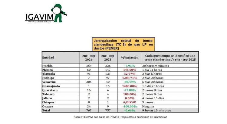 IGAVIM precisó que el análisis se realizó con información proporcionada por PEMEX a través de solicitudes oficiales, y forma parte del seguimiento anual que el organismo realiza en torno al robo de combustible en sus distintas modalidades.