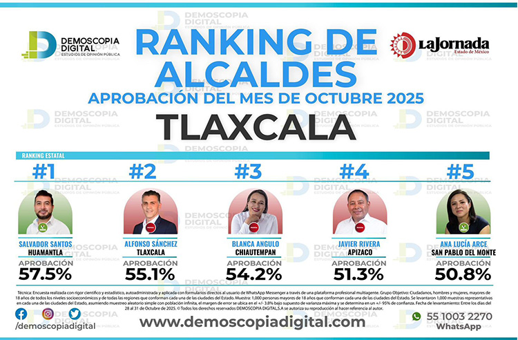 Este resultado coincide con la medición de Demoscopia Digital, que en su ranking estatal lo ubica en el primer lugar entre los alcaldes de Tlaxcala, obteniendo una aprobación del 57.5%, consolidándose como el mejor evaluado en la entidad.