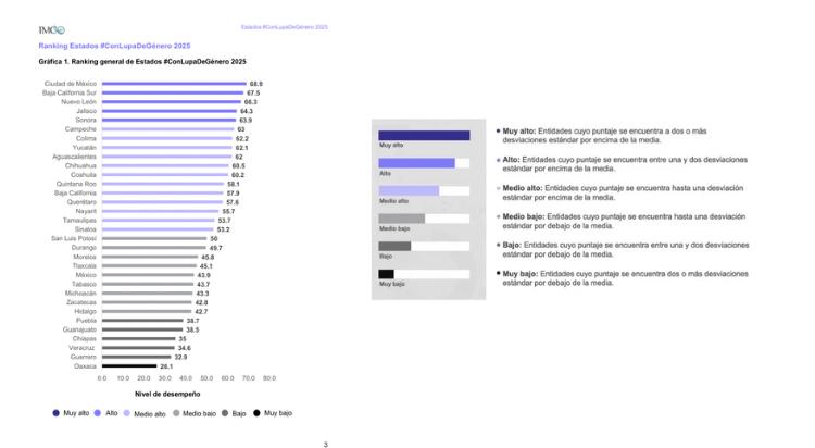 El Instituto Mexicano para la Competitividad (IMCO) presentó el Ranking general de Estados #ConLupaDeGénero 2025, donde se mide el desempeño estatal en materia de igualdad y desarrollo con perspectiva de género. Los resultados muestran contrastes significativos entre entidades, incluyendo la posición que ocupa Tlaxcala dentro del mapa nacional.