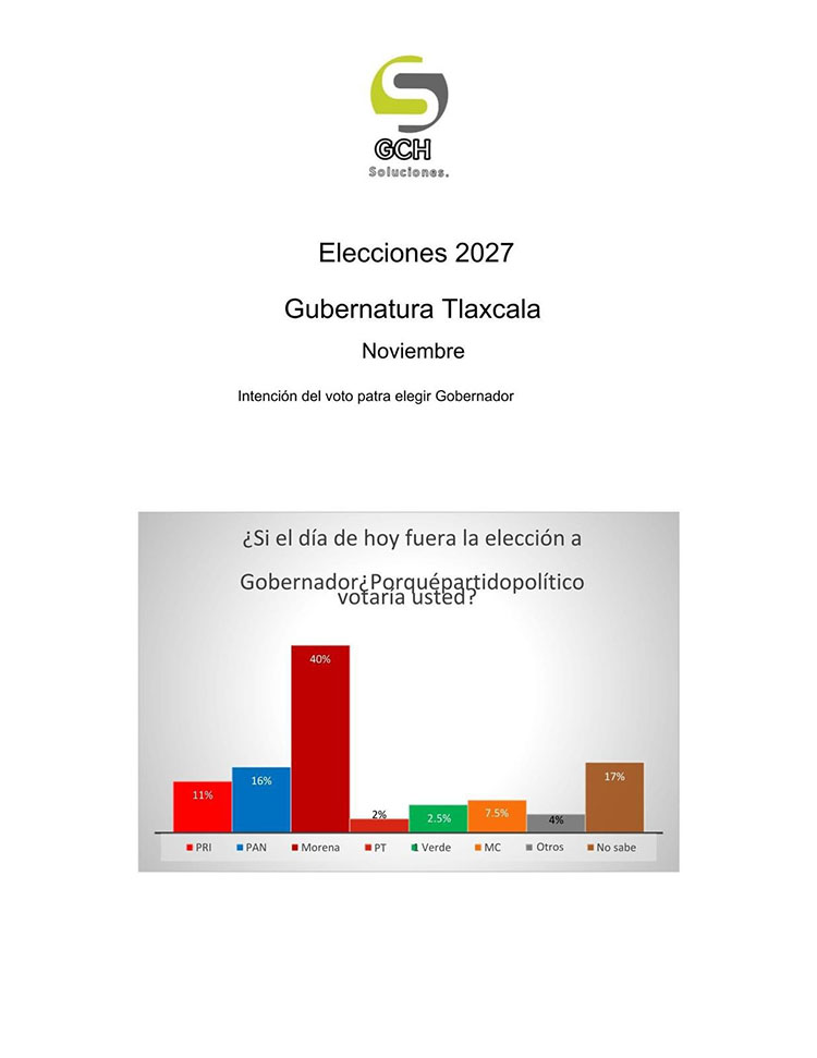 La encuesta, levantada durante el mes de noviembre, arroja datos reveladores sobre la reconfiguración del mapa político en Tlaxcala. Ante la pregunta «¿Si el día de hoy fuera la elección a Gobernador, por qué partido político votaría usted?», el PAN alcanza el 16% de las preferencias electorales.