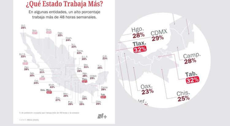 En este contexto, un análisis del Instituto Mexicano para la Competitividad (IMCO) muestra que Tlaxcala se mantiene entre los estados con mayores exigencias laborales. La entidad registra un 32% de personas que trabajan más de 48 horas a la semana, cifra que comparte con Tabasco y Estado de México.