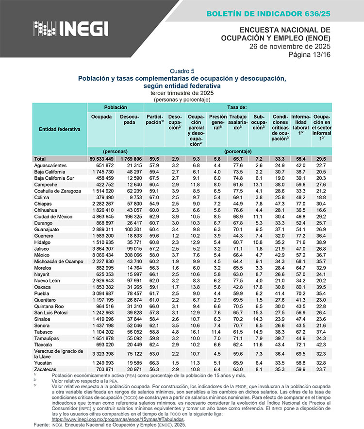 Asimismo, se identificó una tasa de “Trabajo asalariado” de 62.4 por ciento, “Subocupación” de 11.6 y una de “Ocupación en el sector informal” de 42.3 por ciento, respecto del Tercer Trimestre de la presente anualidad, según el INEGI.