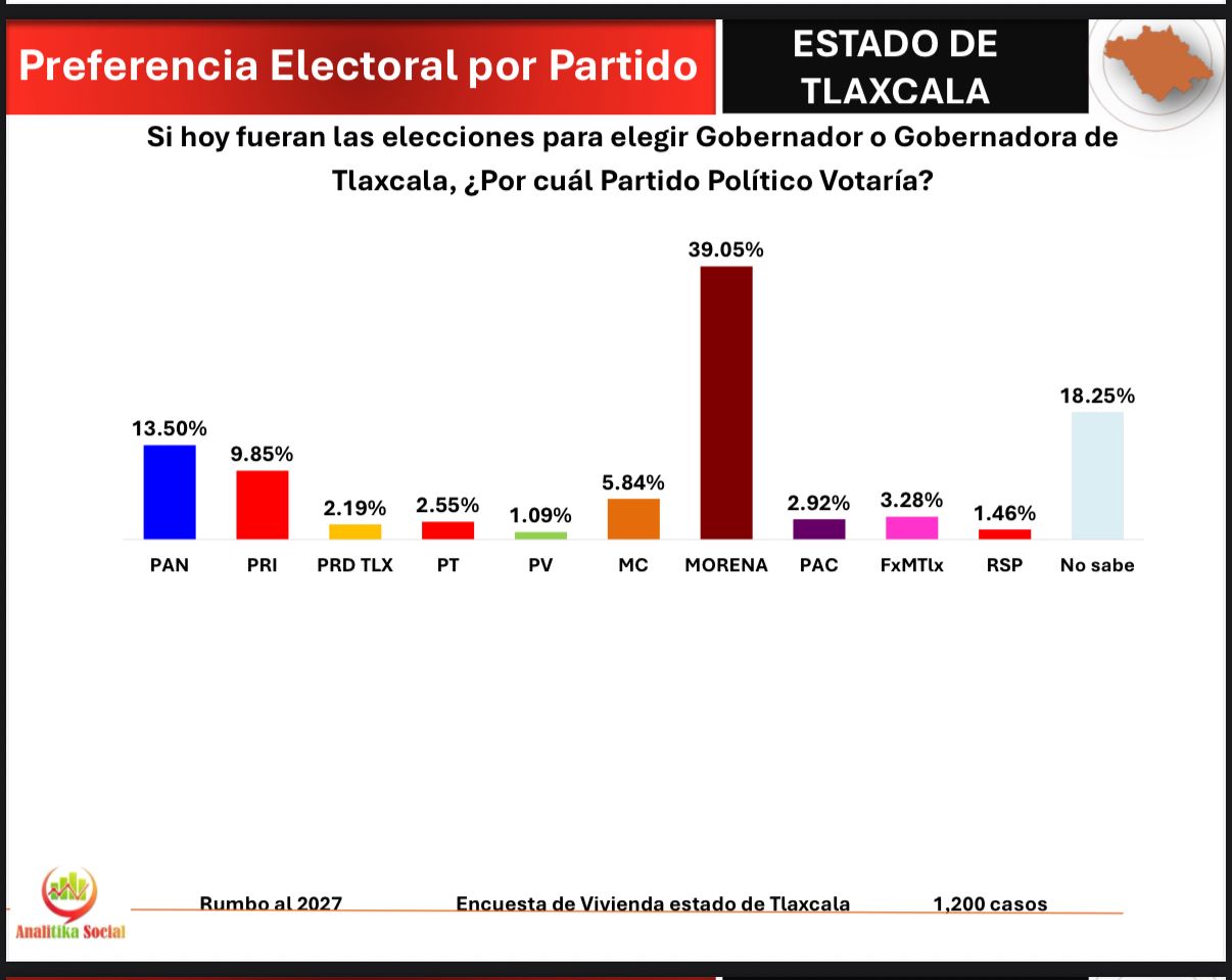 Tlaxcala, Tlax., a 1 de diciembre de 2025.- De acuerdo con el más reciente estudio de opinión pública «Rumbo a la Gubernatura de Tlaxcala 2027», realizado por la firma Analitika Social, el Partido Acción Nacional (PAN) muestra una tendencia sólida de crecimiento, afianzándose como la segunda fuerza política en el estado y la principal opción de cambio para las familias tlaxcaltecas.