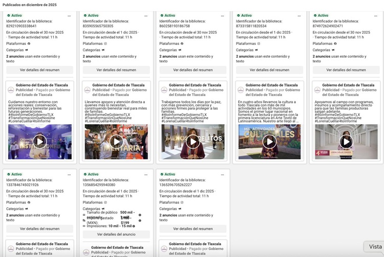 De acuerdo con la opción de “Transparencia” de la página oficial del “Gobierno del Estado de Tlaxcala” en Facebook, la administración de la ex priísta ha pagado por la publicidad de 26 anuncios publicados desde este domingo pasado.