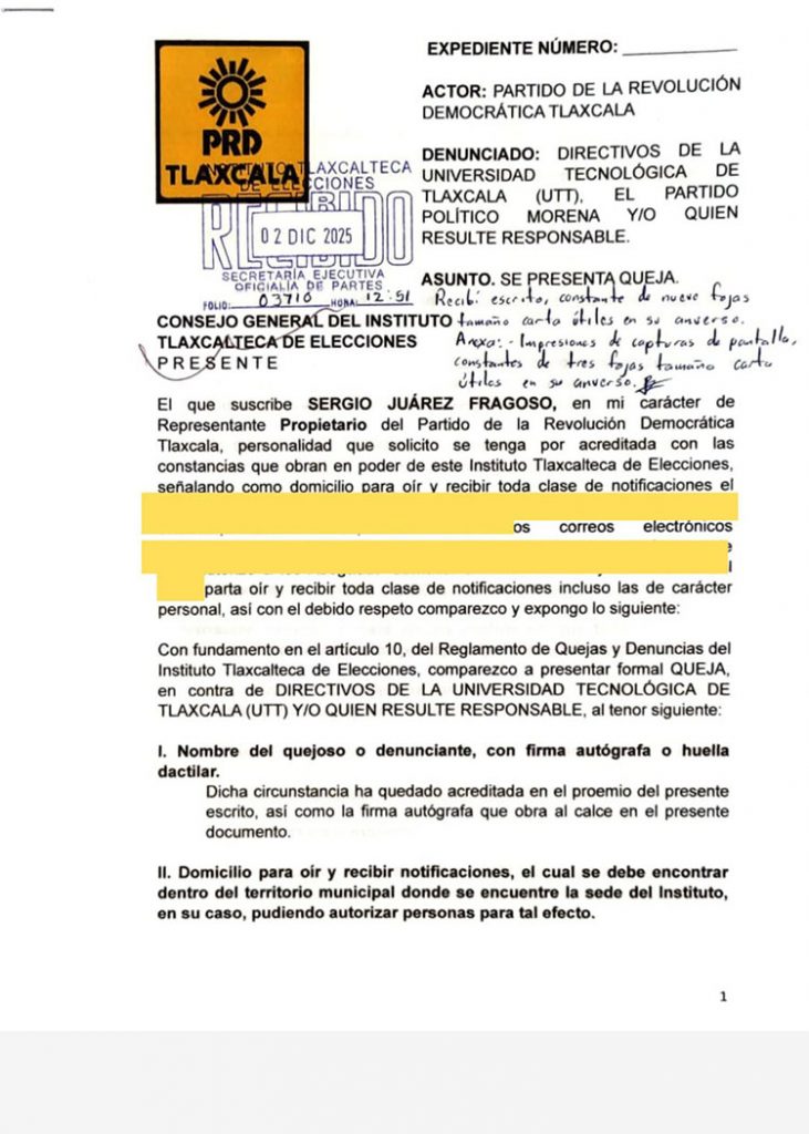 El Partido de la Revolución Democrática Tlaxcala presentó este martes, ante el Instituto Tlaxcalteca de Elecciones, una denuncia formal derivada de los hechos recientemente revelados en la prensa donde da a conocer que en las Universidades Tecnológica de Tlaxcala y Politécnica de Tlaxcala, se han señalado presuntas prácticas de proselitismo político, condicionamiento académico y presión a estudiantes para favorecer a un partido político en funciones de gobierno.