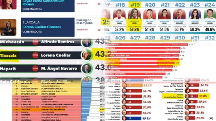 Al término de su cuarto año de mandato, la electa de Movimiento Regeneración Nacional (MORENA), Lorena Cuéllar Cisneros, se mantiene entre los 10 gobernadores peor evaluados del país, en cuatro de seis encuestas ocupa el lugar 28 de 32, teniendo una aprobación de apenas 4 de cada 10 tlaxcaltecas.