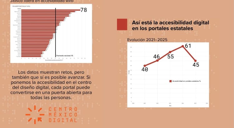 Datos presentados por Centro México Digital muestran que, entre 2021 y 2025, la accesibilidad en los portales estatales del país pasó de 40% a 45%. Aunque en 2024 se alcanzó un máximo de 61%, la caída registrada para 2025 evidencia la falta de continuidad en las políticas públicas orientadas a fortalecer la inclusión digital.