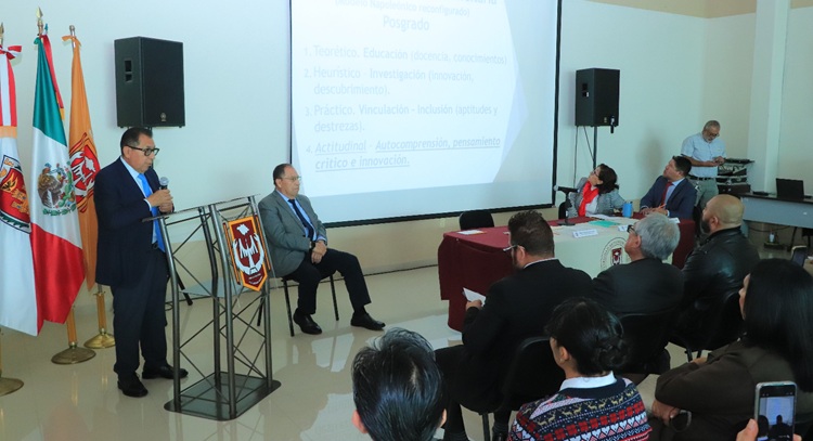 Ante coordinadores de los diferentes programas de posgrado y de integrantes de la estructura de gobierno universitario, el Doctor Ortiz dictó la conferencia “Modelo Humanista Integrador basado en Capacidades: Un modelo educativo republicano”. En su exposición, afirmó que el modelo se finca en el pensamiento crítico y el socio-construccionismo que conduce a la conformación de la personalidad de un individuo en dos horizontes civilizatorio y culturizador global.