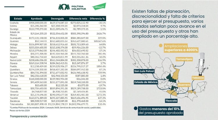 El análisis revisó las partidas 36101, 36201 y 33605, relacionadas con difusión gubernamental, promoción comercial e información en medios masivos. Estas cifras provienen del sistema COMSOC y de las Cuentas Públicas 2024, donde se registra el gasto estatal en comunicación social.
