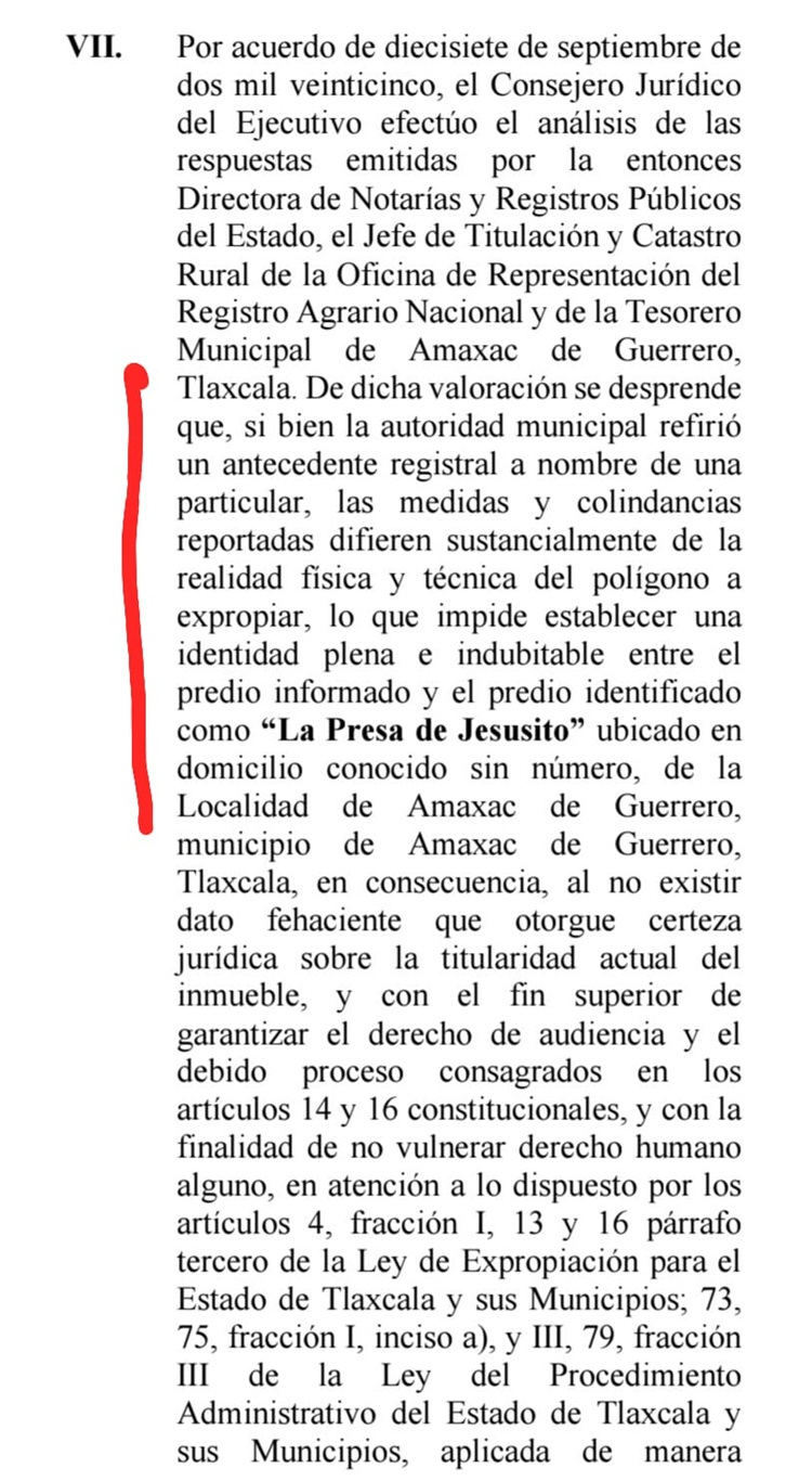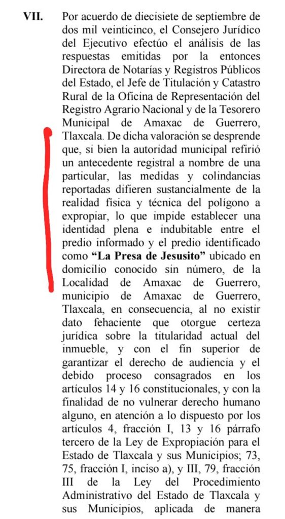 Cabe señalar que, el Gobierno del Estado, a través de la Oficialía Mayor de Gobierno (OMG) que dirige Ramiro Vivanco Chedraui, publicó el pasado 20 de noviembre de 2025 el Expediente de Expropiación 03/2025 correspondiente al predio conocido como “La Presa de Jesusito”, supuestamente de la localidad de Amaxac.