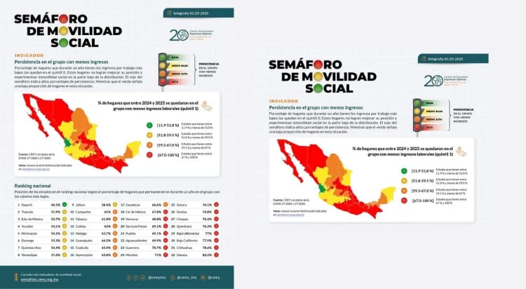 Tlaxcala ocupa el segundo lugar nacional con menor persistencia en el grupo de menores ingresos, de acuerdo con el Semáforo de Movilidad Social del Centro de Estudios Espinosa Yglesias (CEEY). El reporte establece que 51.9% de los hogares tlaxcaltecas permanecieron entre 2024 y 2025 en el quintil de ingresos más bajos, una cifra que, aunque inferior a la de la mayoría de los estados del país, evidencia que más de la mitad de las familias sigue sin mejorar su condición económica.