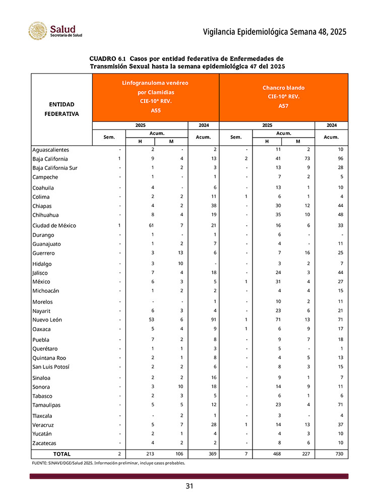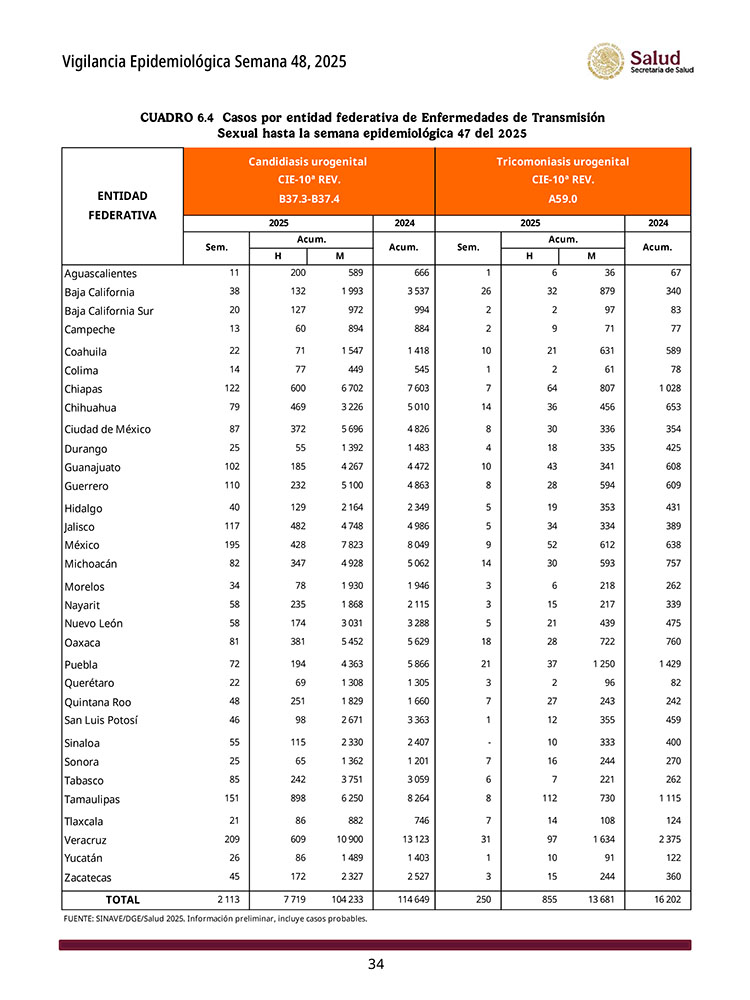 Finalmente, la dependencia federal registró dos casos de linfogranuloma venéreo, tres de chancro blando, 968 de candidiasis urogenital y 122 de tricomiasis urogenital.
