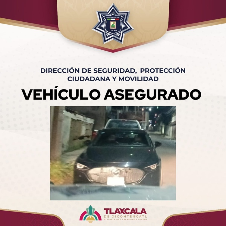 Como parte de las acciones permanentes de vigilancia y verificación, elementos de la policía municipal de Tlaxcala detectaron y aseguraron un vehículo sospechoso marca Mazda modelo 2023 que presentaba diversos antecedentes legales, entre ellos un reporte de robo y un embargo vigente.