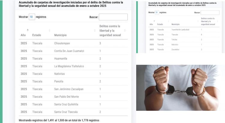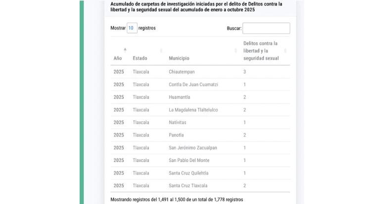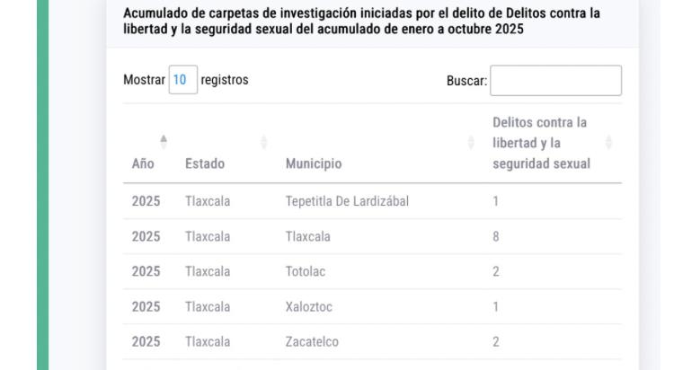De acuerdo con el registro de México Unido Contra la Delincuencia, en el apartado “Carpetas -Delitos contra la libertad y la seguridad sexual” de la Incidencia delictiva en México, 17 municipios de Tlaxcala reportaron al menos una carpeta de investigación iniciada por este tipo de delitos durante el periodo comprendido de enero a octubre de 2025.