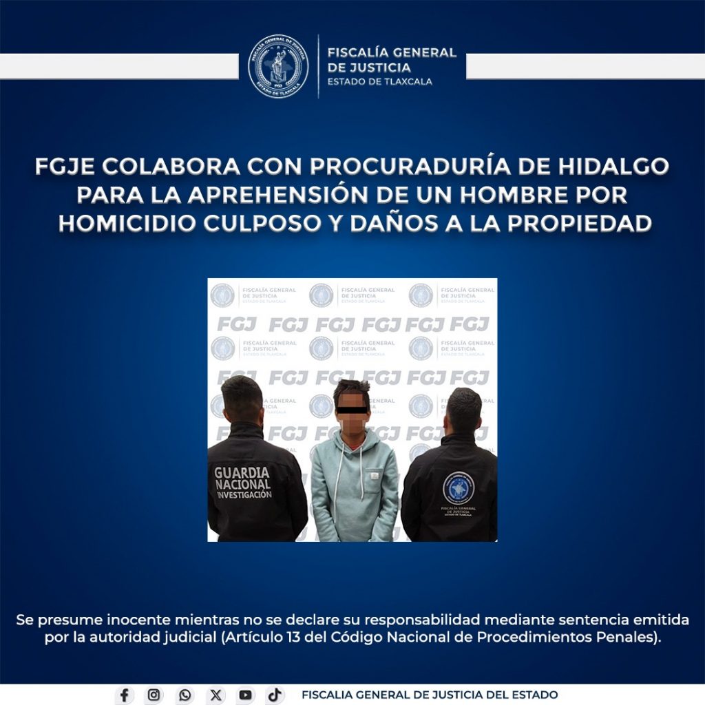 La Fiscalía General de Justicia del Estado (FGJE) colaboró con la Procuraduría General de Justicia del Estado de Hidalgo (PGJEH) para la aprehensión de Iván N., por su probable responsabilidad en los delitos culposos con resultado típico de homicidio y daños en la propiedad.