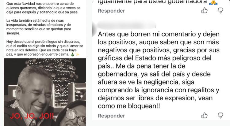 En los espacios de comentarios de dichas publicaciones, si bien predominaron mensajes positivos y buenos deseos propios de la temporada decembrina, también aparecieron expresiones críticas que cuestionan la situación de seguridad y la atención en materia de salud. Algunos usuarios señalaron su inconformidad por los asaltos, robos al transporte, presuntos secuestros y extorsiones, así como por la falta de medicamentos, particularmente en hospitales públicos.