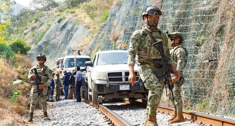 Elementos de la Marina y la Guardia Nacional custodian la zona donde el Tren Interoceánico se descarriló el domingo.