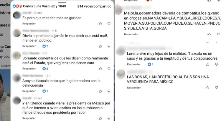 Otros comentarios hicieron referencia al aumento de delitos como robos, asaltos y homicidios en municipios como Zacatelco, Apizaco y en la región sur de Tlaxcala, así como a presuntas omisiones en el combate a actividades delictivas en zonas específicas del estado. En ese mismo sentido, ciudadanos mencionaron supuestas deficiencias en la actuación policial y la falta de resultados en materia de procuración de justicia.