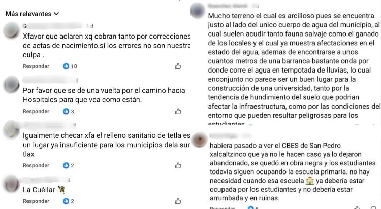 En relación con la Universidad Rosario Castellanos, algunos usuarios manifestaron preocupación por las condiciones del terreno donde se construye el plantel, al señalar características del suelo, la cercanía con un cuerpo de agua y la presencia de una barranca, factores que, según los comentarios, podrían representar riesgos para la infraestructura y la seguridad de la comunidad universitaria.
