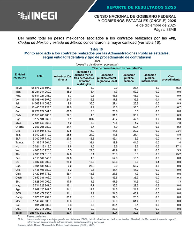 De acuerdo con los Censos Nacionales de Gobierno Federal (CNGF) y de Gobiernos Estatales (CNGE) de 2024, Tlaxcala ocupó el segundo lugar a nivel nacional con la mayor cantidad de contratos realizados por Adjudicación Directa con el 88.8 por ciento de los cinco mil 104 que celebró durante 2024.