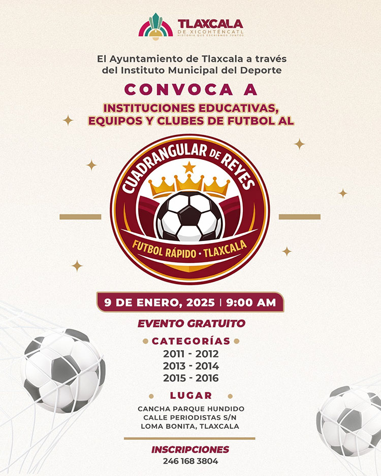 El Ayuntamiento de Tlaxcala, a través de la Coordinación de Deporte Municipal, convoca a instituciones educativas, equipos y clubes de futbol a participar en el Cuadrangular de Reyes de futbol rápido, que se llevará a cabo el próximo 9 de enero, a partir de las 9:00 horas, en la cancha del Parque Hundido en El Loma Bonita, como parte de las acciones orientadas a fomentar el deporte y la sana convivencia entre niñas y niños de la capital.