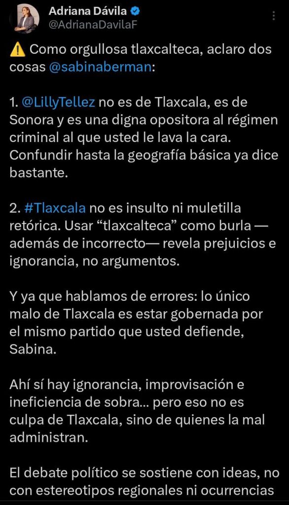 La panista posteó «Como orgullosa tlaxcalteca, aclaro dos cosas @sabinaberman… Tlaxcala no es insulto ni muletilla retórica. Usar “tlaxcalteca” como burla —además de incorrecto— revela prejuicios e ignorancia, no argumentos»
