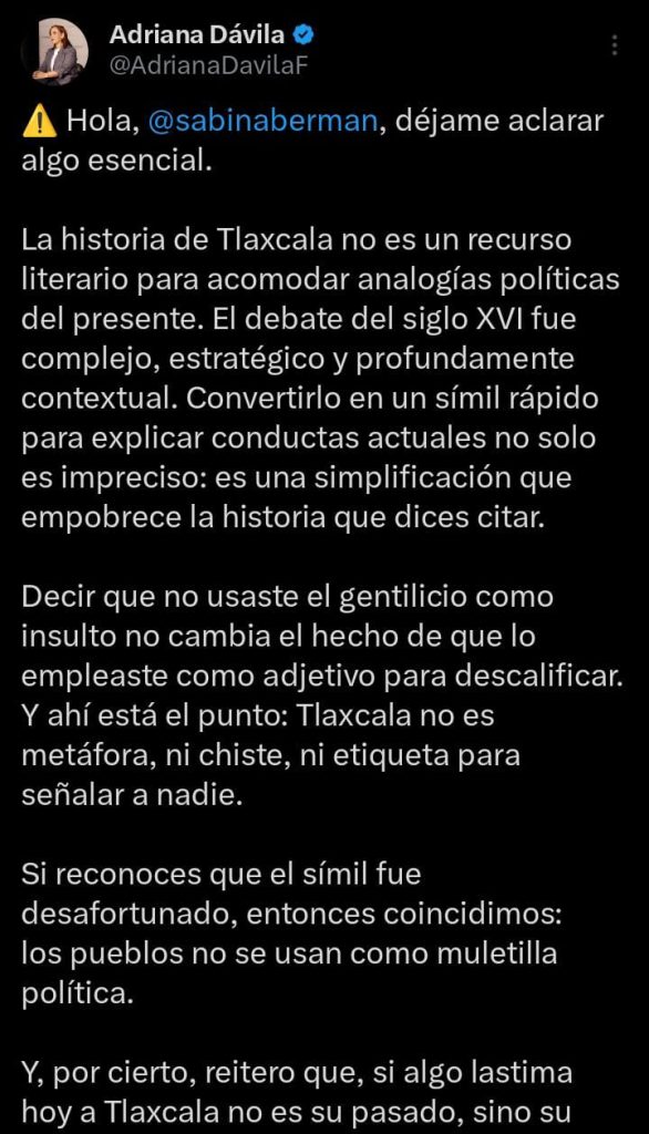 «…La historia de Tlaxcala no es un recurso literario para acomodar analogías políticas del presente… Decir que no usaste el gentilicio como insulto no cambia el hecho de que lo empleaste como adjetivo para descalificar. Y ahí está el punto: Tlaxcala no es metáfora, ni chiste, ni etiqueta para señalar a nadie».